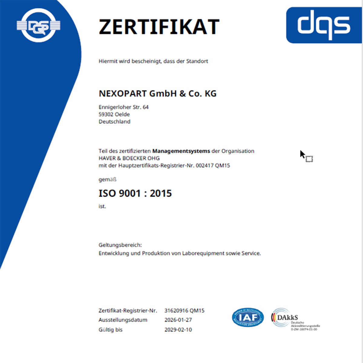 Höchste Qualität, geprüfte Prozesse und kontinuierliche Verbesserung stehen bei NEXOPART im Fokus. Seit 2024 ist NEXOPART erfolgreich nach DIN EN ISO 9001 : 2025 zertifiziert und erfüllt damit die aktuellen Anforderungen an ein wirksames Qualitätsmanagementsystem. Die Zertifizierung bestätigt unsere klar strukturierten Abläufe, unsere Kundenorientierung sowie den Anspruch auf dauerhafte Prozesssicherheit. So schaffen wir eine verlässliche Basis für reproduzierbare Ergebnisse und nachhaltige Qualität in Labor und Industrie.